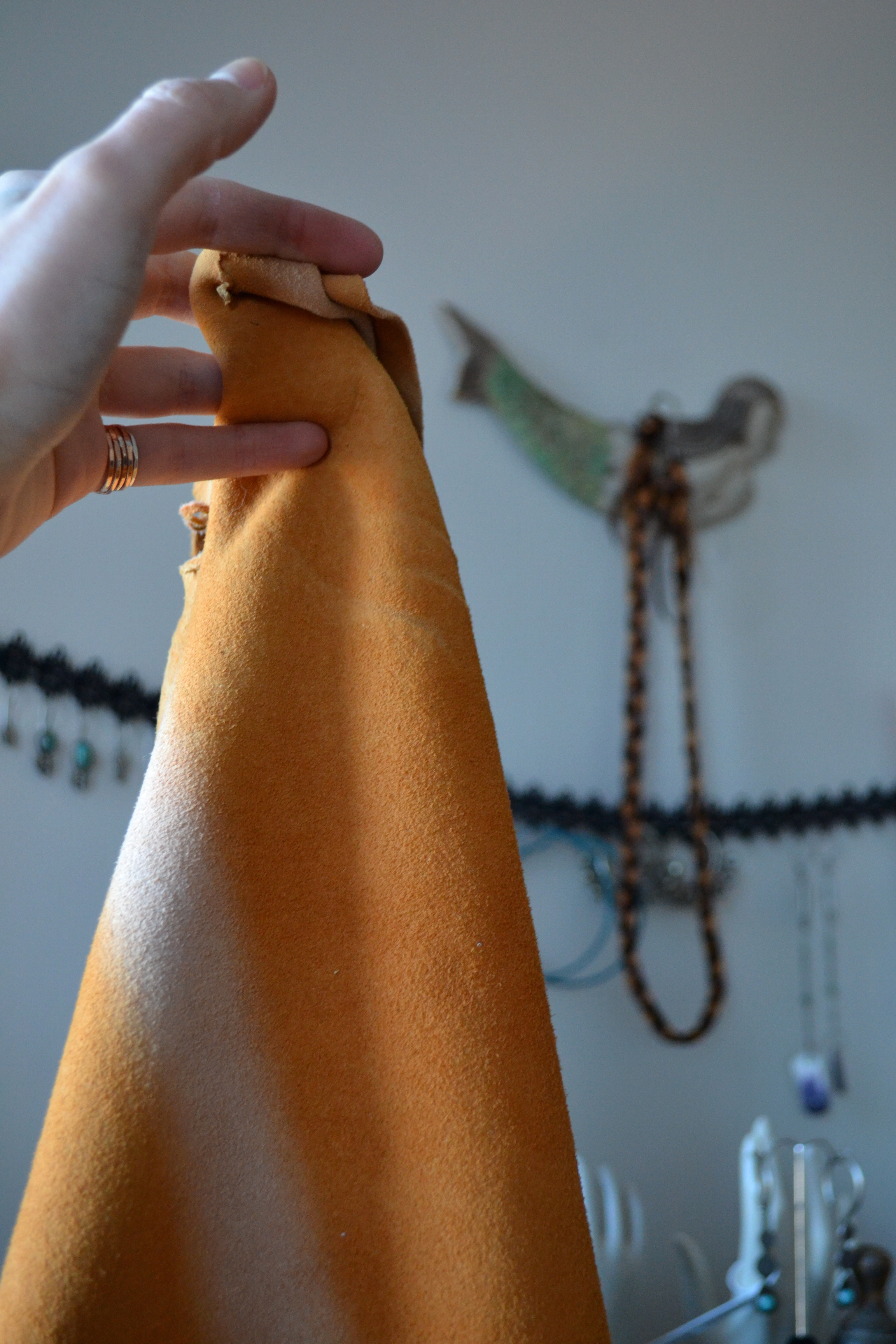 In addition, I’ve been hanging full hides in front of my window so certain folds can be lightened by the sun. This has over months created a really lovely ombre effect in the leather colouring.
