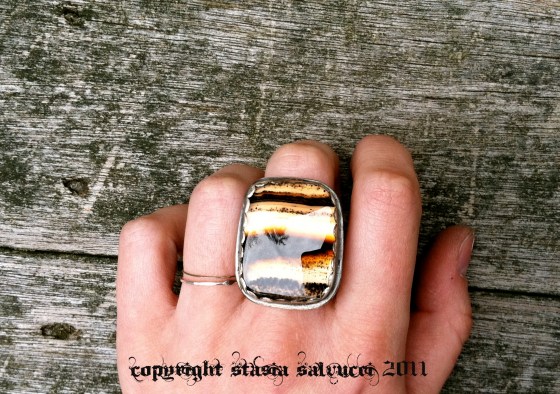 Burning Bright Ring~RESERVED~featuring a striped montana agate stone in oxidized silver with the quote “Tiger, Tiger, Burning Bright”, from William Blake’s poem stamped on the back.