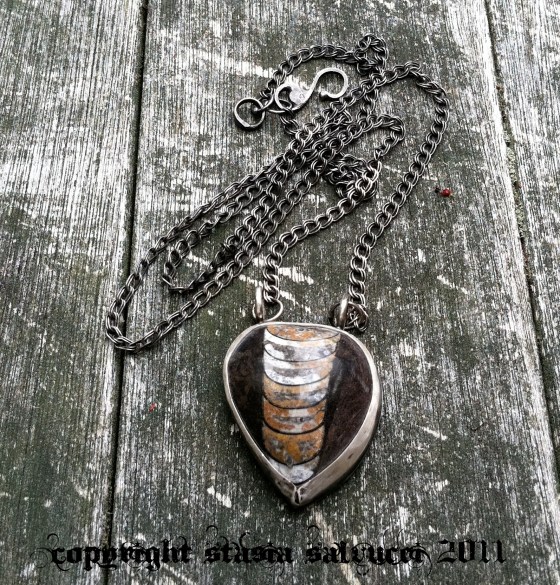 Fossil Necklace~Coming soon to the shop! Features a cephalopod fossil in pure silver on a sterling backing and long chain. This has a dragonfly sawed out on the back!
