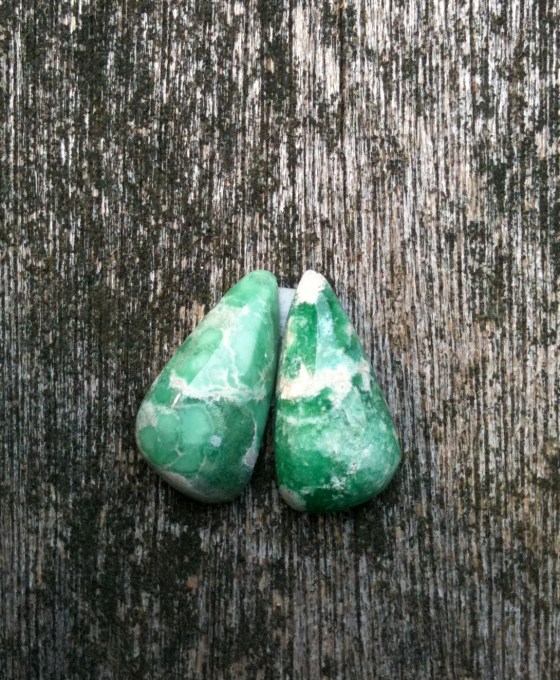 Variscite-also from the Southwest like Turquoise. The bottom pic is of a matching pair. Top pic the larger stone is roughly 1.5″ tall.