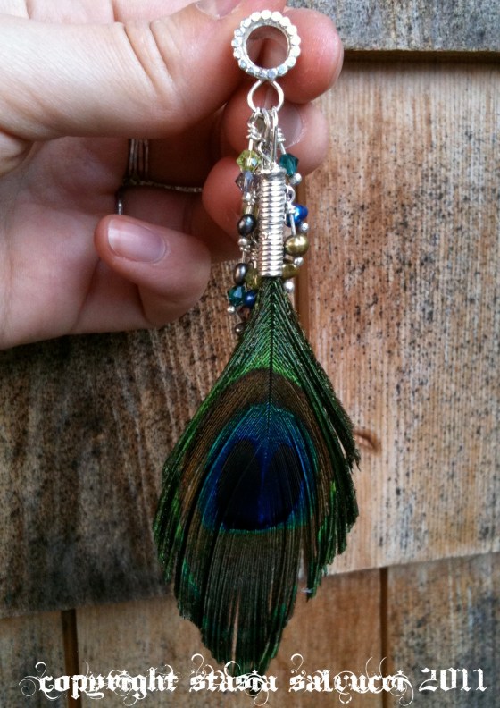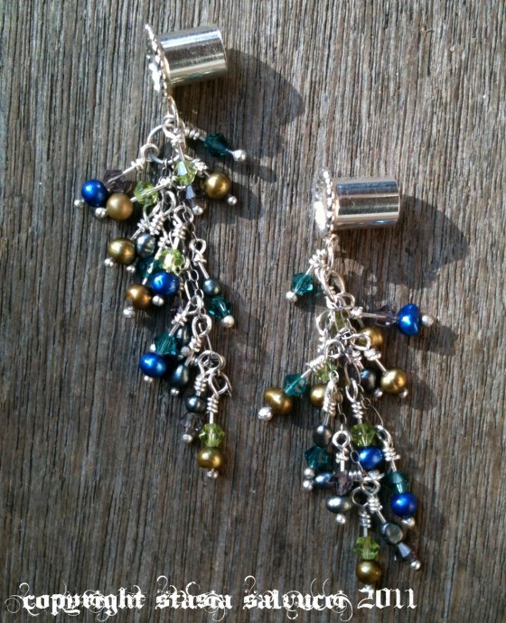 These PEACOCK PLUGS were a custom order~LOVED making these. They’re actually detachable. Sterling scalloped tunnel plugs with oxidized sterling chains. From the chains dangle mini crystals and freshwater pearls in peacock feather themed colors. The peacock feather earrings with hand forged sterling clamps/earring hooks are separate.