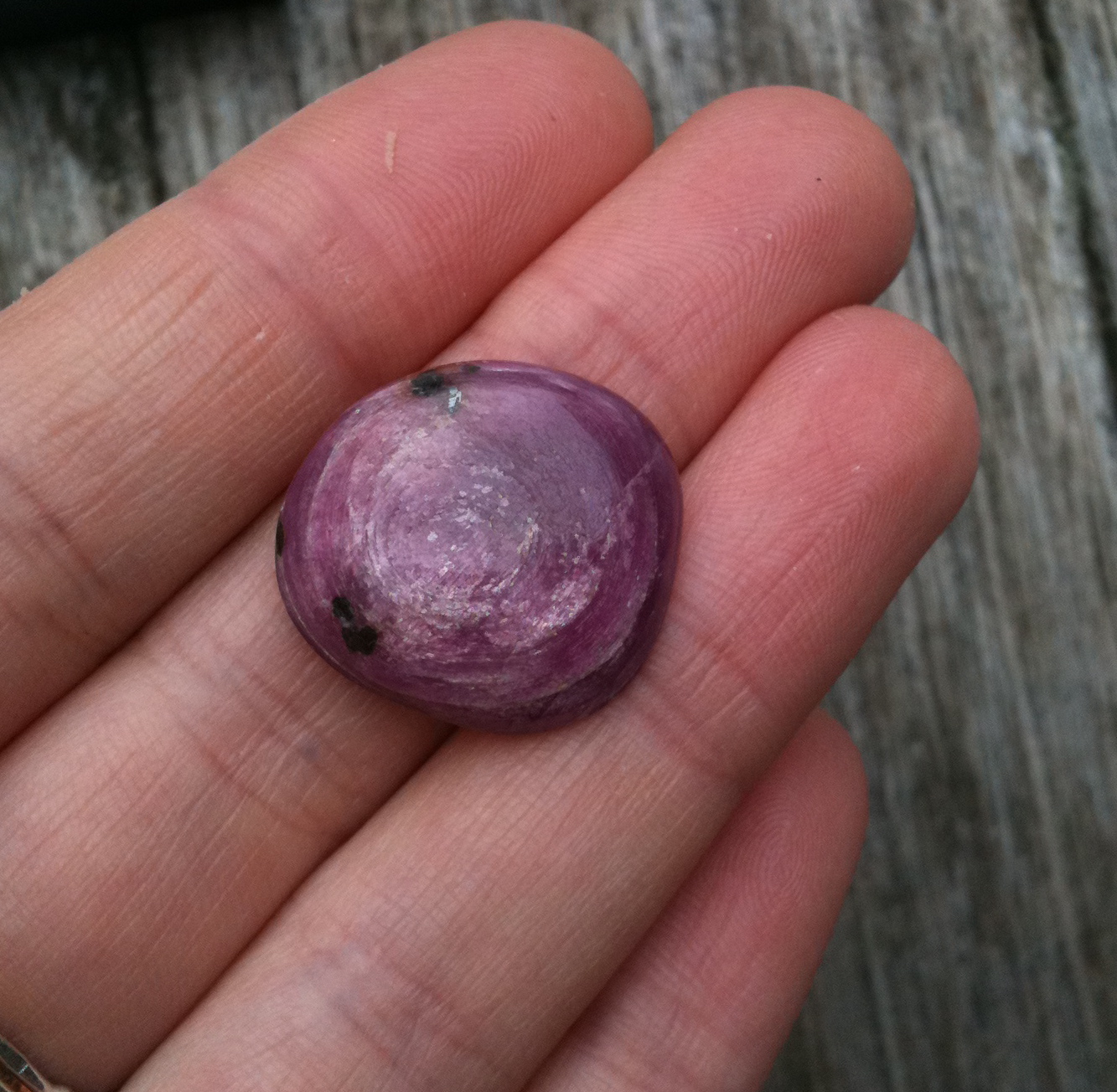 This one is a RAW RUBY. Yes. That’s right. Genuine ruby-this is what you start with before you grind, cut, and facet it down into a gemstone. This stone is fairly large, and raw. A lovely light wine color.