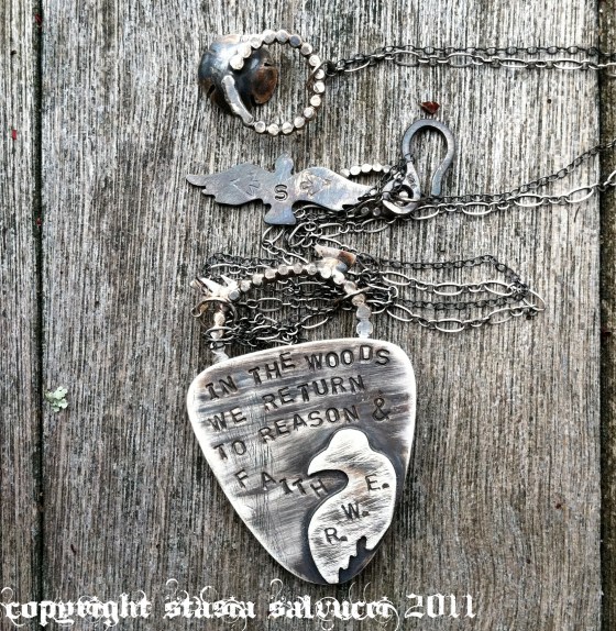 This was a custom order. TALISMAN NECKLACE~I loved creating this one. It features a Kings Manassa Mine turquoise, all hand forged sterling goodies and an amethyst gemstone flower clasp. The back features a raven and a quote by Emerson. I will definitely be making more of these domed gemstone flower for gauges and earrings!