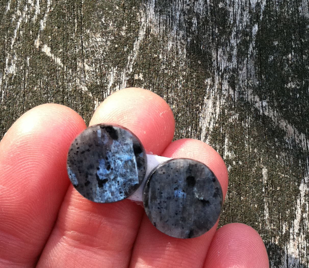 This is a stone similar to labradorite called larvikite. This is a mix of rainbow moonstone and some other black stone-incredible flashes of a more slate blue/gray. Perfect for gauges (0 or 00 gauge).