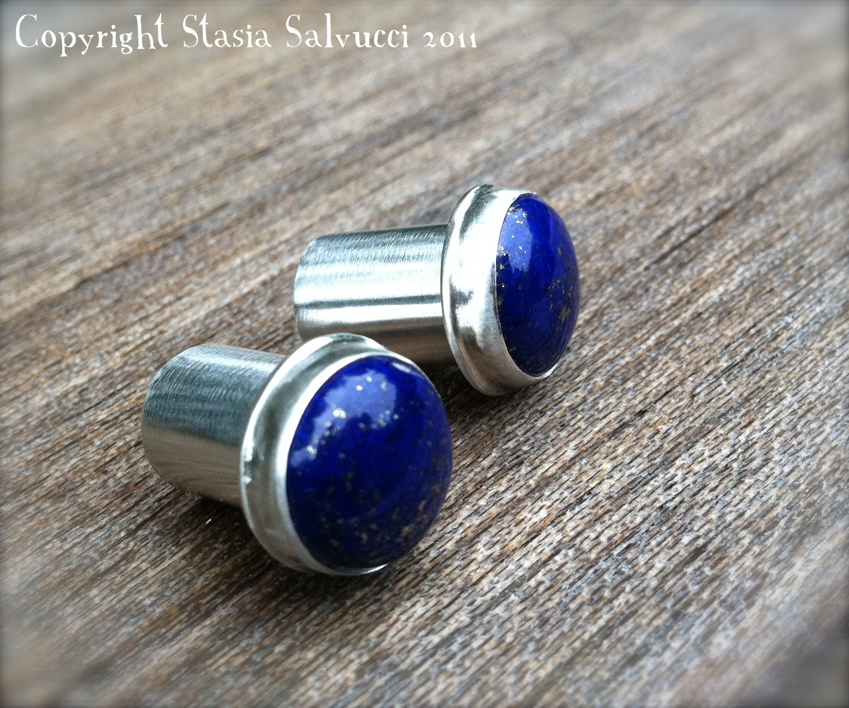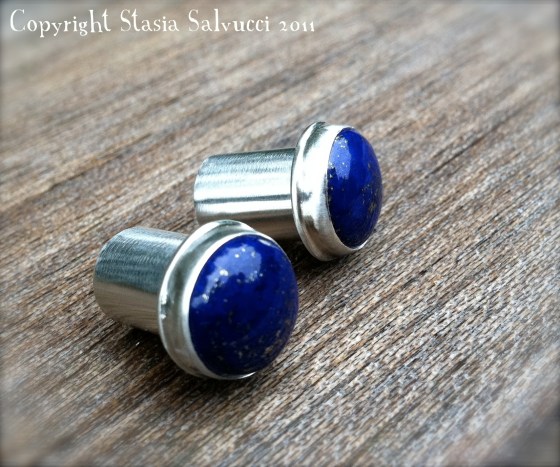 below~finished lapis lazuli with pyrite inclusions plugs, King’s Manassa Mine turquoise and feather silver dangle plugs…