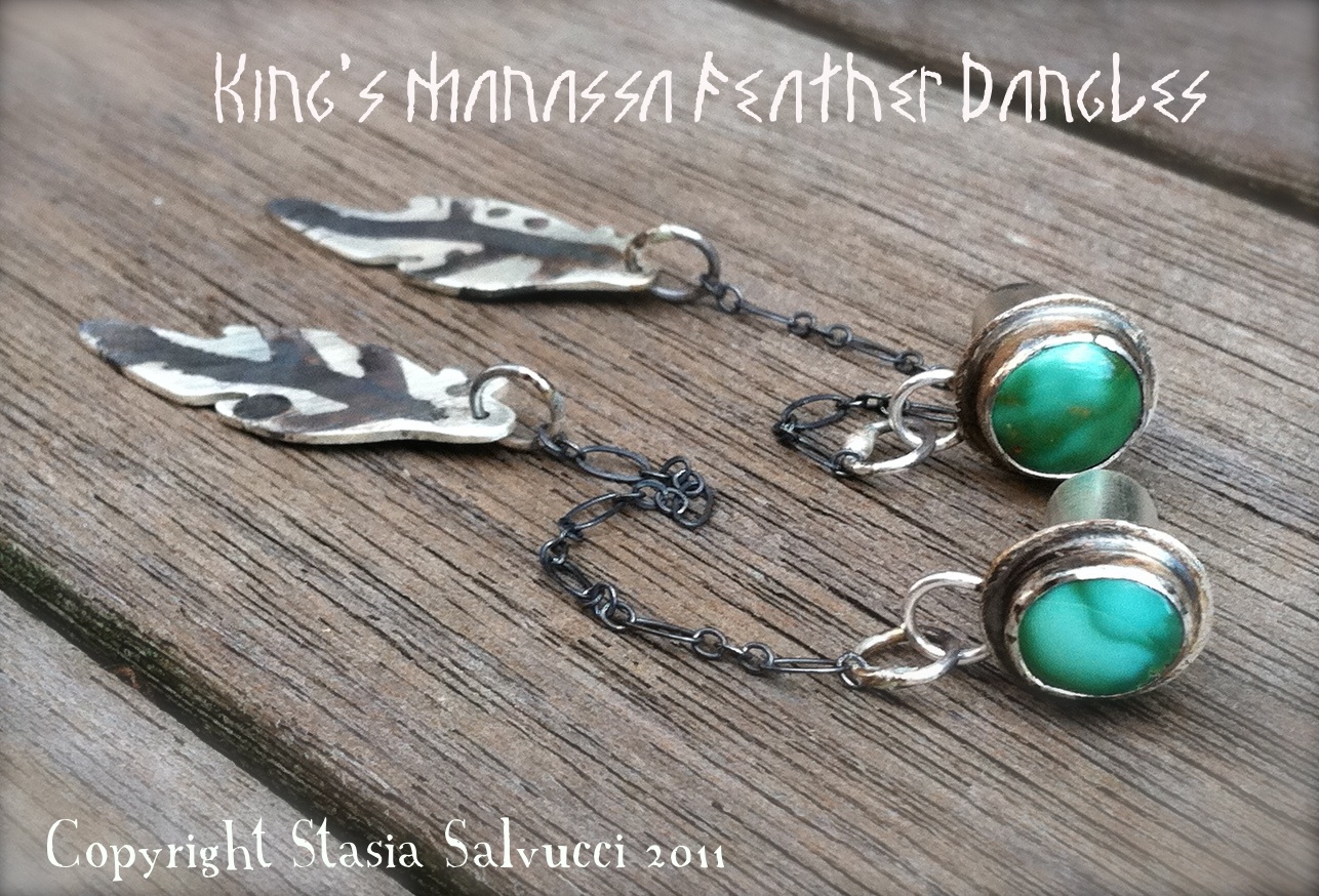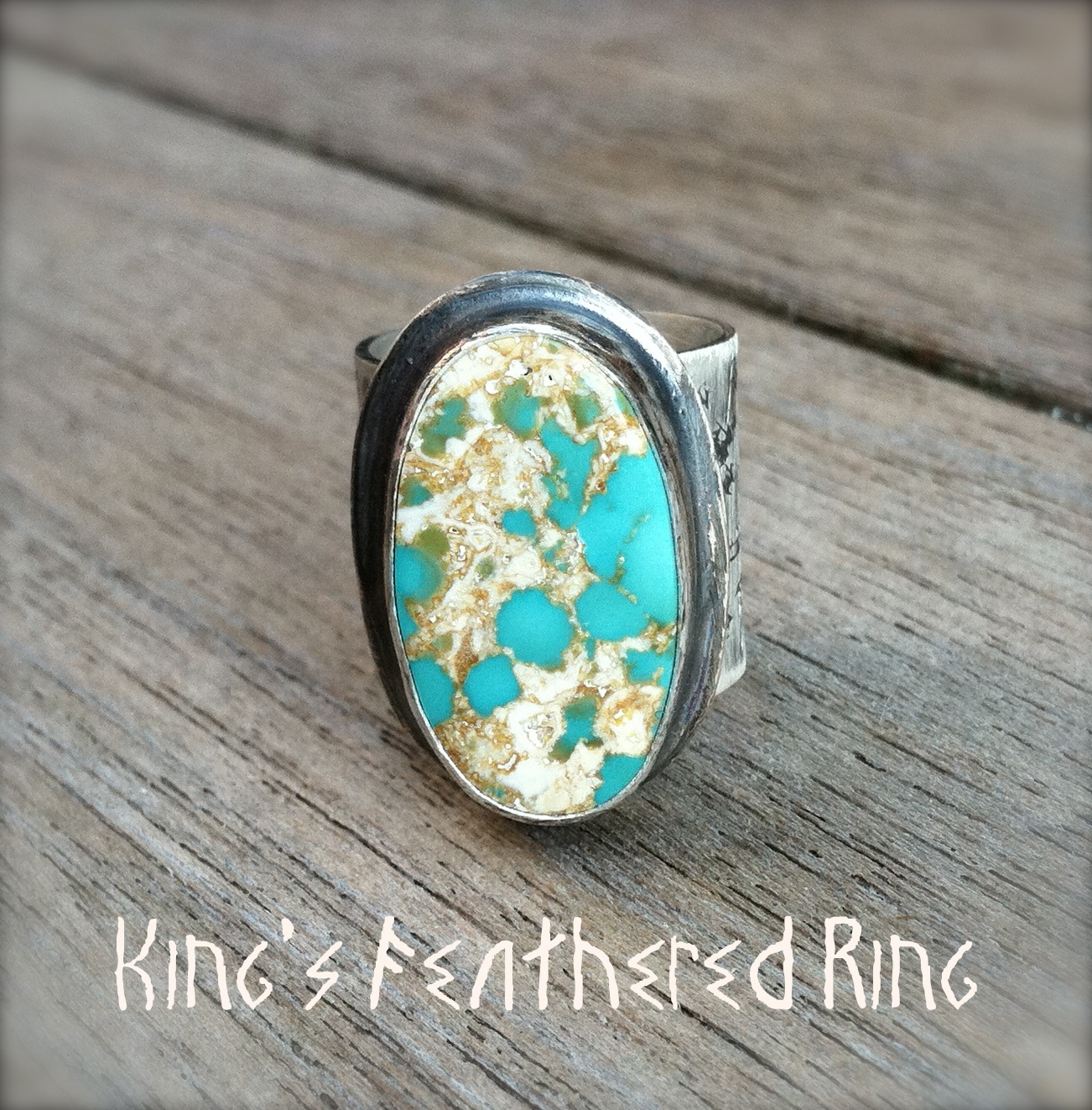 AND! The King’s Feathered Ring, featuring a really funky rare natural King’s Manassa Mine turquoise stone, and a thick fat feathered satin finished ring band. Ring size is 5.5 on a mandrel, but because of the width of the band will fit *at least* 1/2 size smaller…