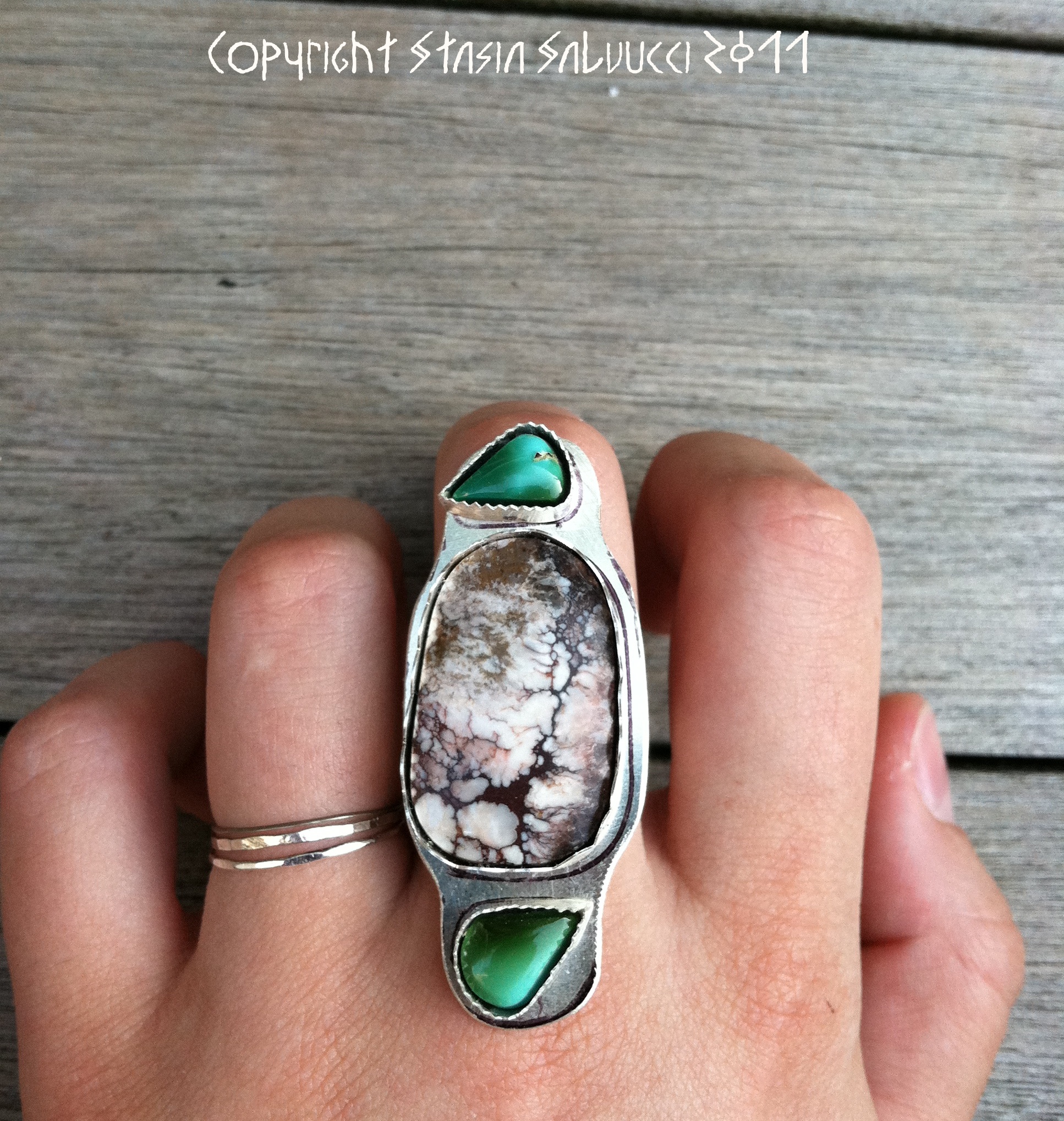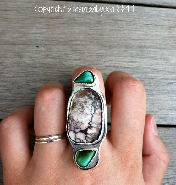 Also a soon-to-be ring is the Southwest History ring with natural King’s Manassa Mine teardrop turquoise and a stunning Wild Horse Magnesite in sterling, possibly 14k rose gold fill embellishments (size undetermined)
