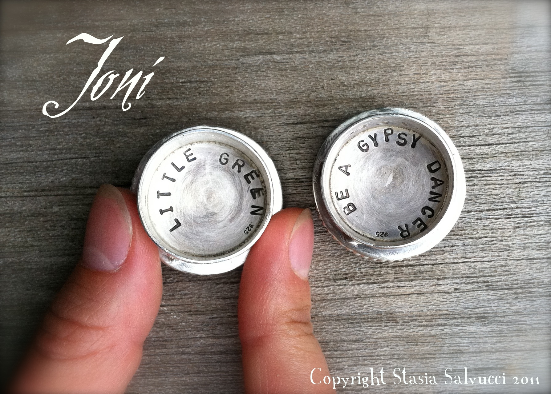 Also recently finished were a pair of 1 inch hollow sterling plugs featuring 3 King’s Manassa Mine turquoise stones on each plug earring, ornate borders, and secret Joni Mitchell quotes on the the inside backings!