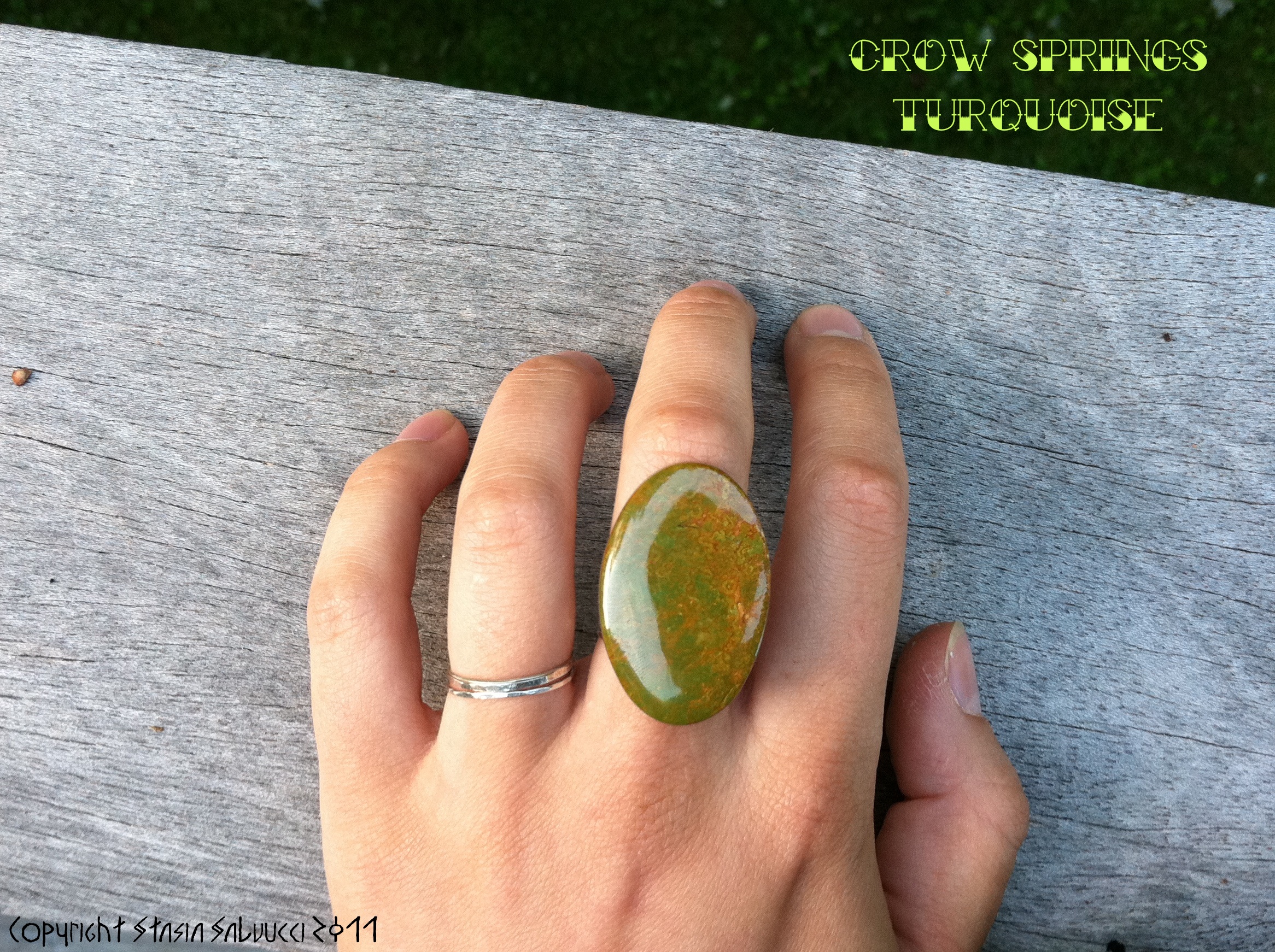 and last but grandest, a superb olive coloured natural turquoise from the Crow Springs Mine, a perfect oval size for ring, bracelet or necklace: