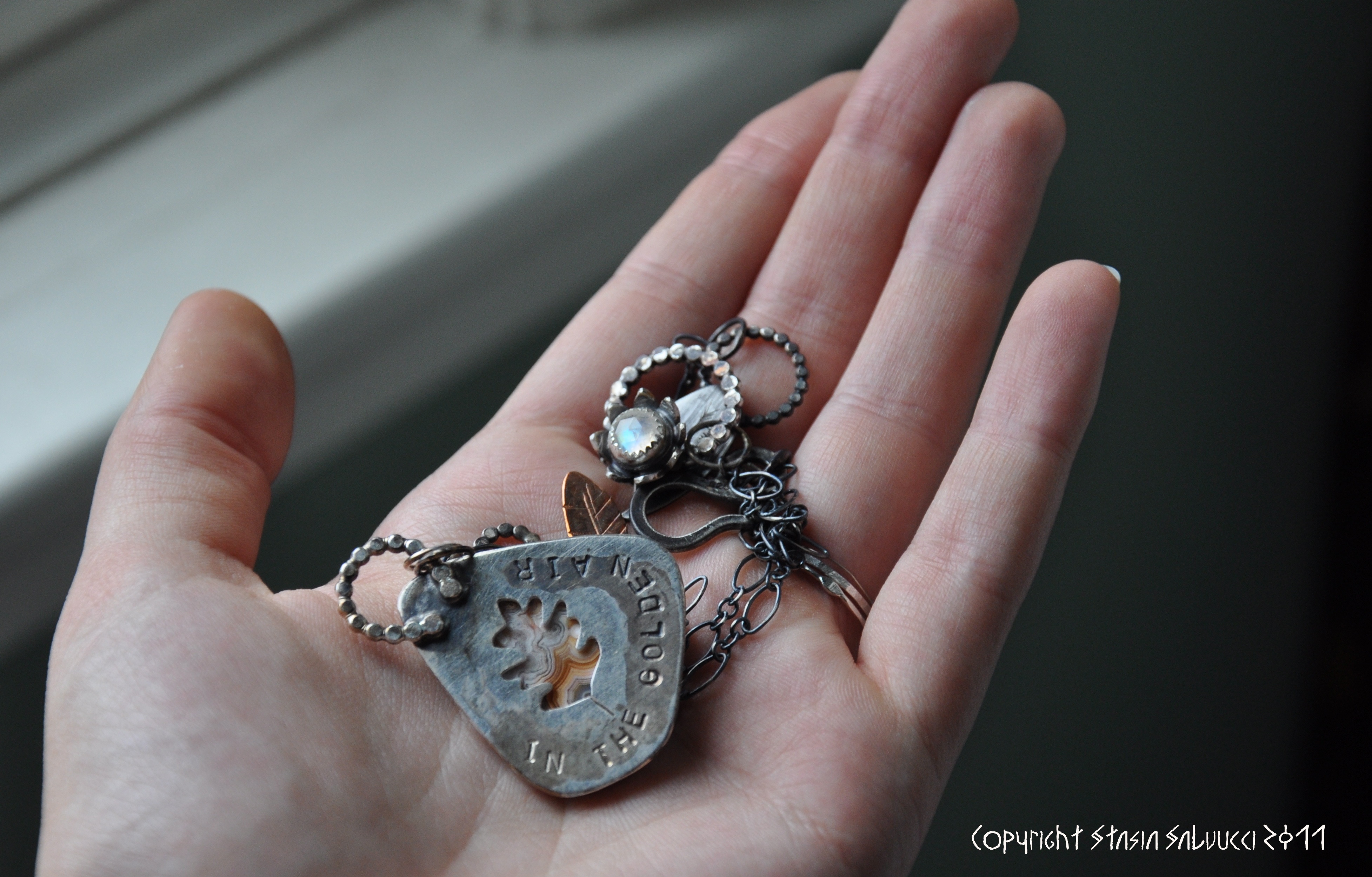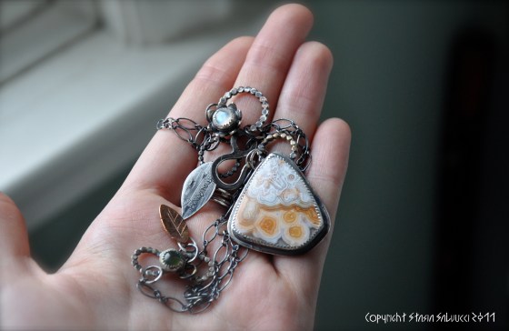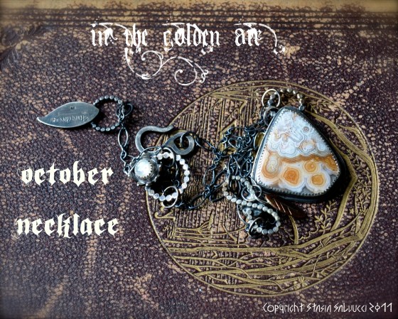 “In The Golden Air“, a necklace for the month of October. The quote is from William Cullen Bryant’s poem “October”. This necklace shall be part of the Romantics Line. It features a beautiful crazy lace agate with swirls that look like orange flowers towards the bottom. A green gem and faceted rainbow moonstone follow bronze and silver leaves up the chain. A little oak leaf has been sawed out in the back, to let the beauty of the stone come through….