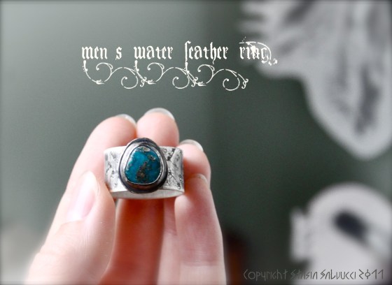 Men’s Water Feather Ring– featuring a piece of high grade turquoise from the Kingman Mine with pyrite in it that I acquired in Bisbee, Arizona. This lovely has been stamped with feathers like my “Feathered Bands”. A perfect rugged piece for the gents who dig the Southwestern look.