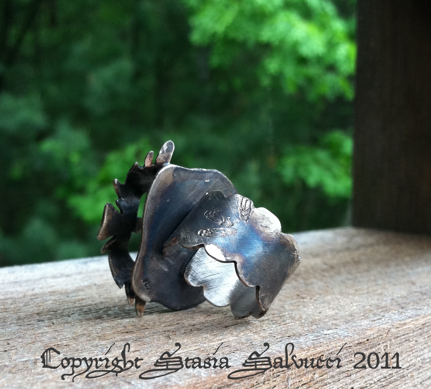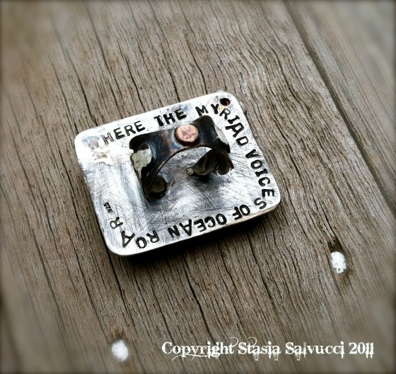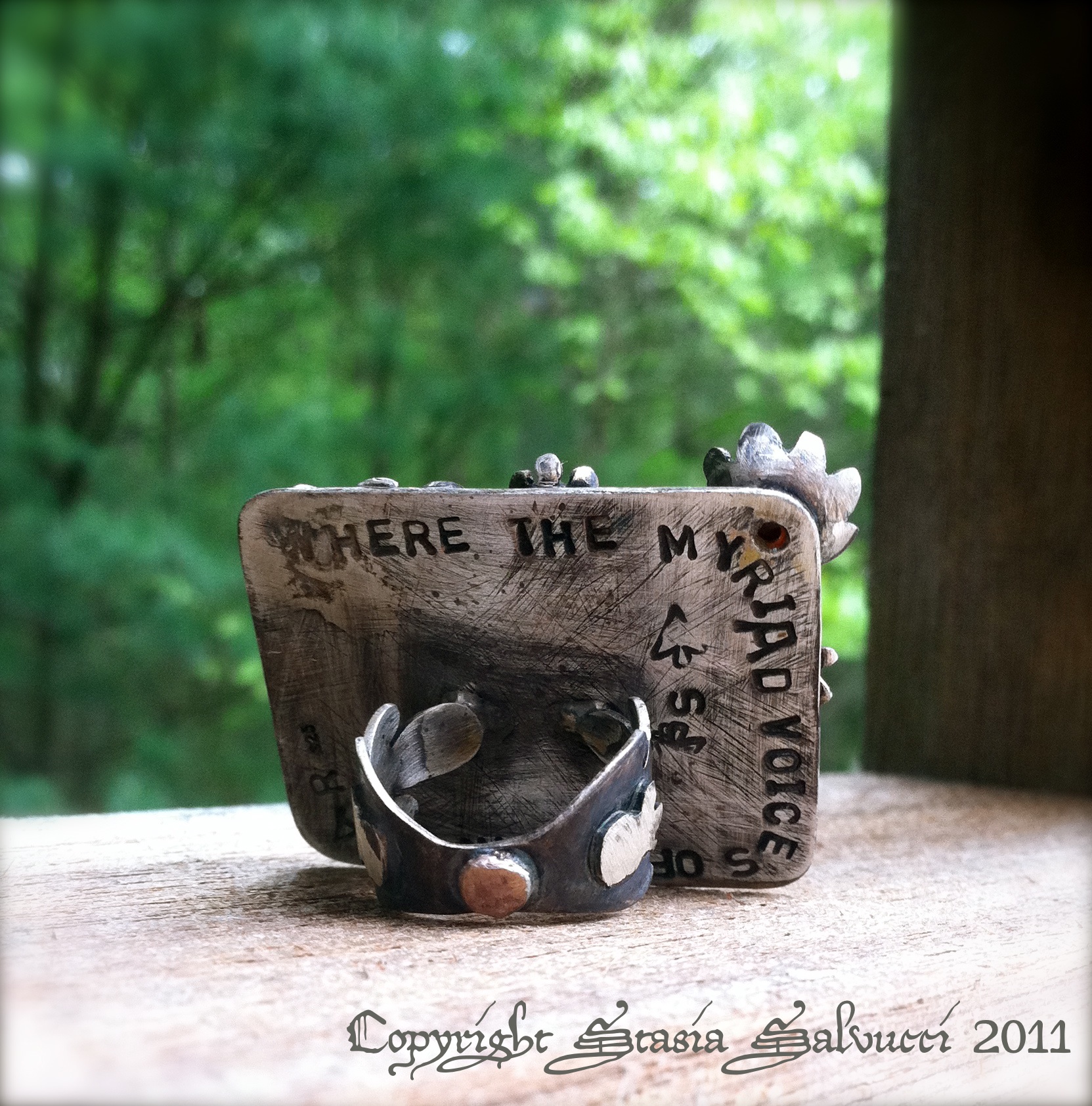 Other newer pieces include mini “Sweet Sayings” rings. These sterling bands feature delightful short quotes by yours truly. Each ring features a different quote, but they can be made to your size upon inquiry. Currently made are: “We are the brazen bold“, and “A darling day for rain” (for the English). These sterling bands are patina darkened and then  polished to a steel like finish, with the darkened quotes hidden on the inside of the ring band. On the outside is my jeweler’s mark. These also make great knuckle rings.