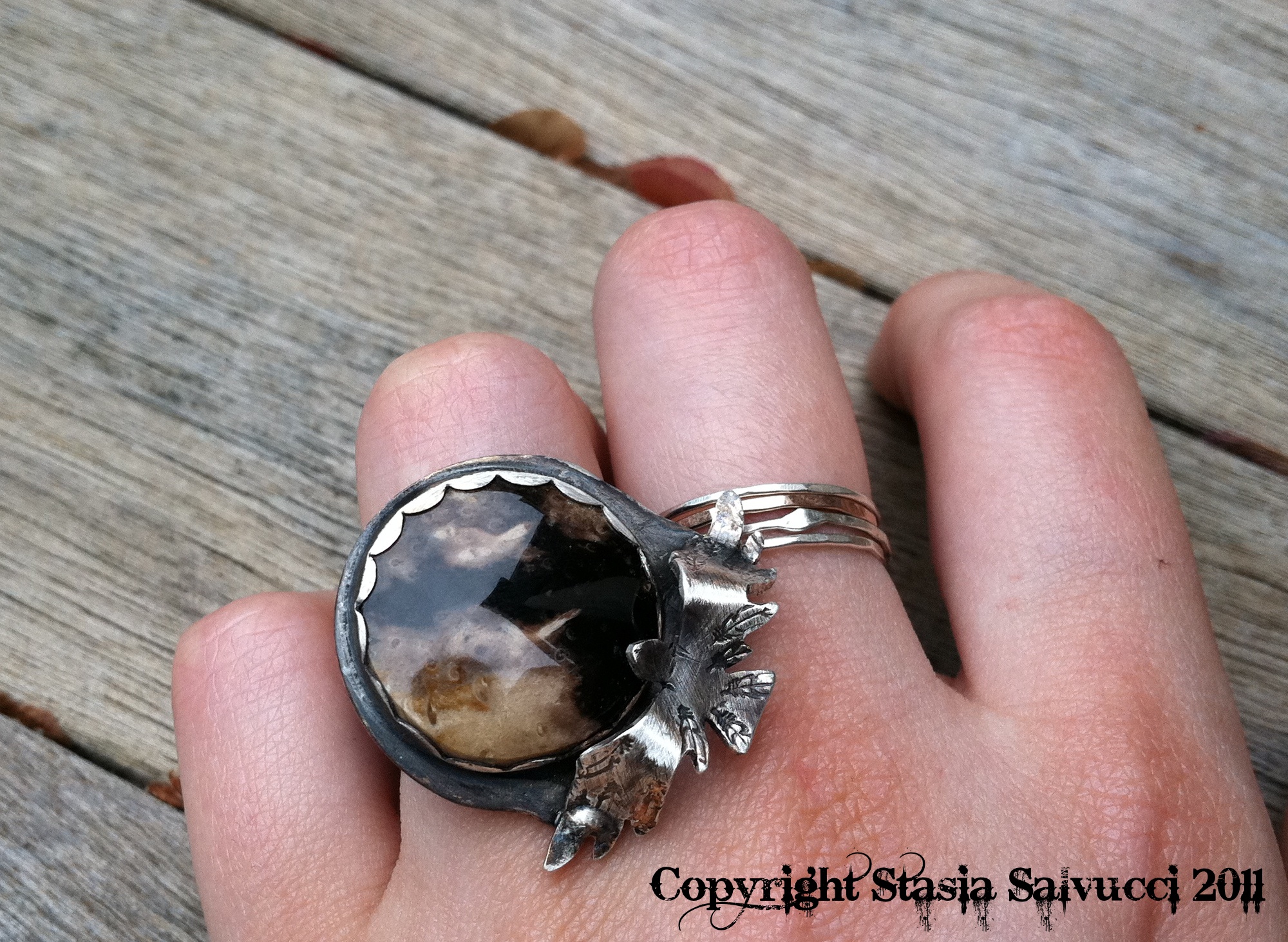 Also new is the FLIGHT NIGHT ring…made of oxidized sterling and petrified palm wood…soon to be in the Etsy shop…