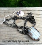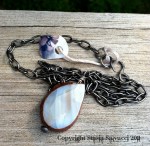 In The Golden Air“, a necklace for the month of October. The quote is from William Cullen Bryant’s poem “October”. This necklace shall be part of the Romantics Line. It features a beautiful crazy lace agate with swirls that look like orange flowers towards the bottom. A green gem and faceted rainbow moonstone follow bronze and silver leaves up the chain. A little oak leaf has been sawed out in the back, to let the beauty of the stone come through….
