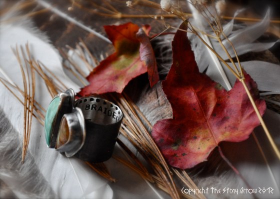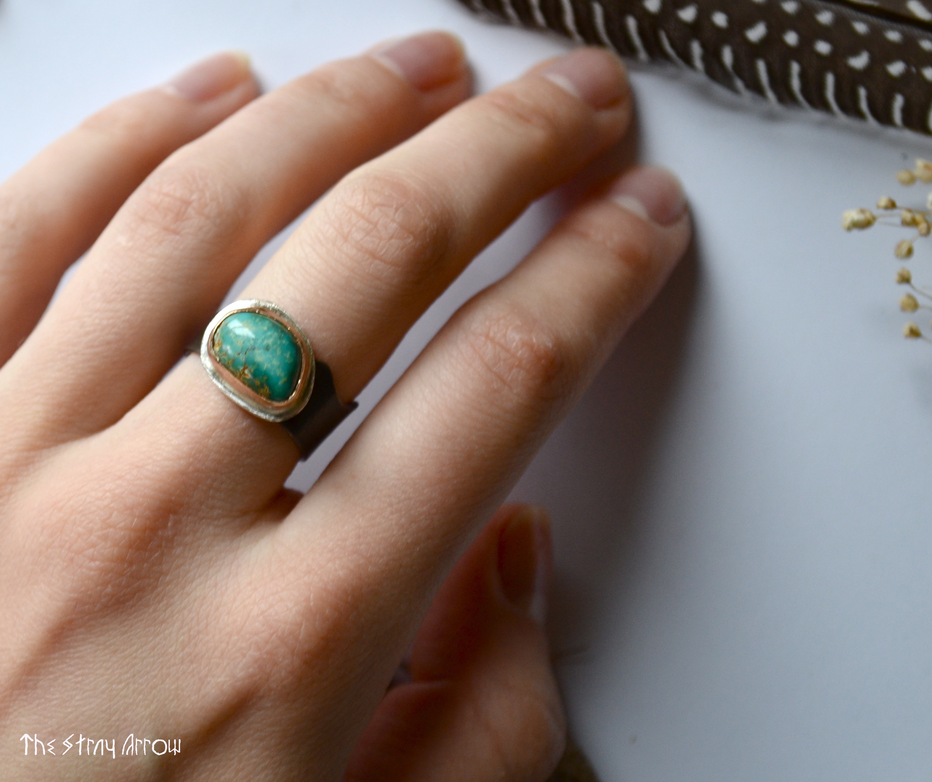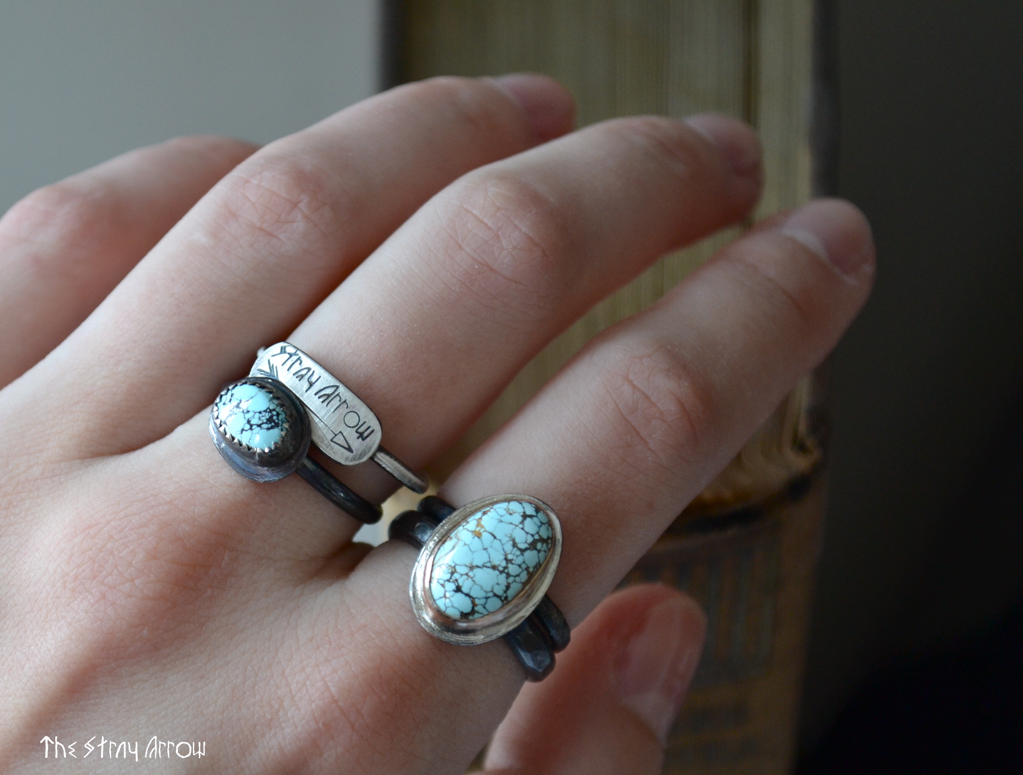 Next up we have two turquoise rings. These both tie into my Romantics theme of poetry quotes, Autumn, and the Southwest. The size 7 3/4  Hour by Hour ring features a rounded triangle cut of ribbon Royston turquoise. On the outside of the ring band lies the quote, “Dead leaves scatter, hour by hour”. This is from Oscar Wilde’s, “Impressions, I Le Jardin”. The second size 6 3/4-7  Tracks in Dusk ring features two different coloured old stock turquoise pieces from the Kings Manassa mine. They resemble abstract animal tracks. The quote on the inside of the ring band reads, “Braided dusks of the oaks“. This is from Sidney Lanier’s, “The Marshes of Glynn”.