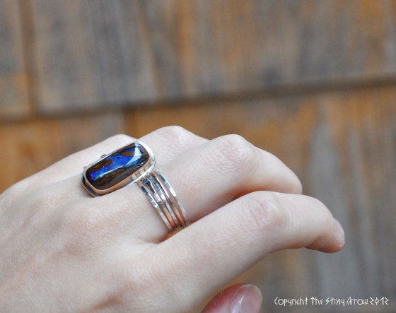First up we have a darling little size 5 koroit boulder opal ring from Queensland, Australia. The opal has been set in a gold fill bezel and blackened silver ring design. Nice and simple to highlight the awesome flash of this rock. The electric royal blue looks like lightning on dark bark, and what really sets this piece apart is the opal matrix in the center of the stone is clear! At the right angle you can see straight through.