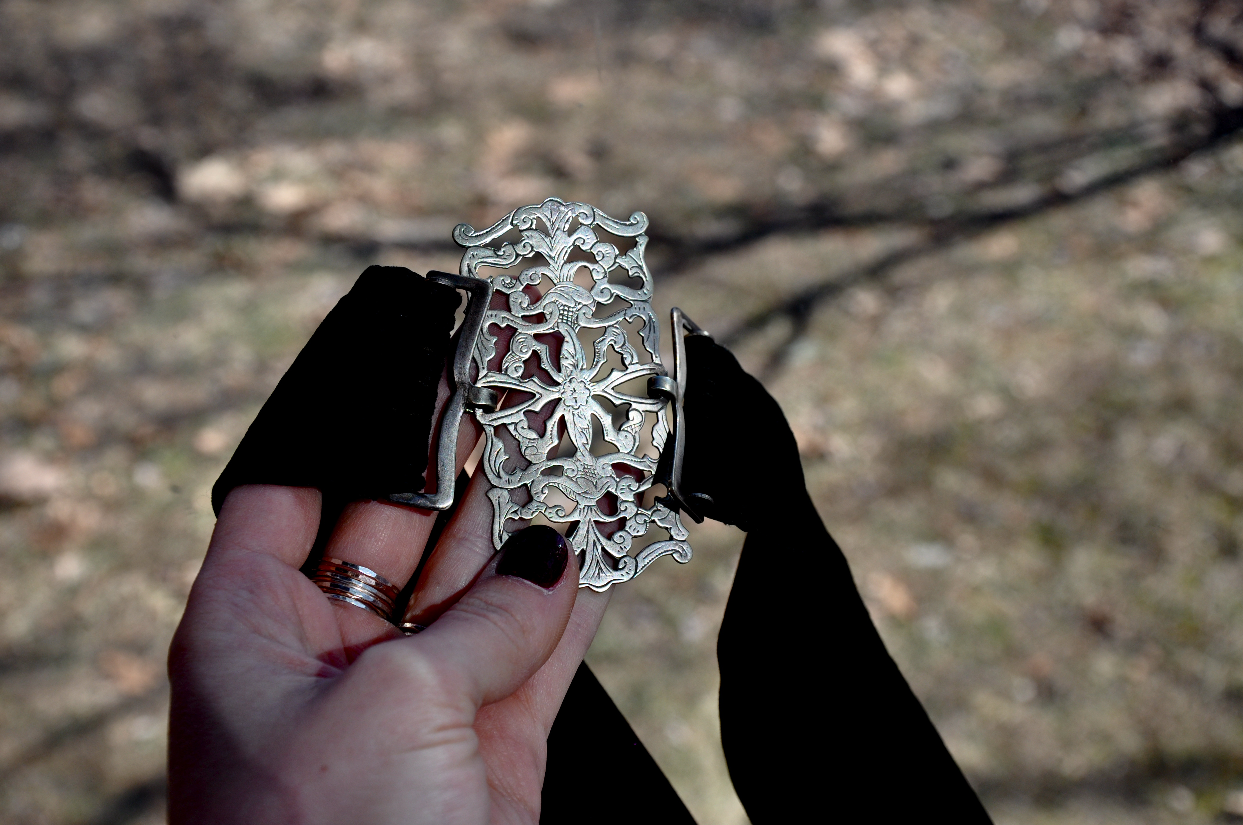 An old (Turkish?) belt, and an all time favourite. I’m not a fan of wearing belts in general, but one of my friends who shares a love in antiquing captured this beauty for me. This Victorian belt is made of old black velvet and silver. It hooks gingerly and because of the era, actually fits me. It’s such a lovely piece with fine detailing…
