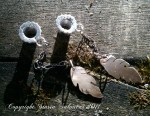 There was plenty of time and then some for set up. I chose a crisp white table cloth, and plain organic woodlands vibe. I paired store bought display cases with my hand built and painted vertical displays. I painted everything to match in two main colours- washed out beachy white/mauve/gray, and dark wood. As my jewelry pieces as a whole cover many different themes and tastes while still be easily identifiable as “Stray Arrow Wear”, I wanted to keep the table clean looking while still being cluttered with jewels. The second day the bark discs I drilled holes in to keep rings tied down was traded for a long darker piece of drift wood for ring display. Here are a couple shots, click on any photos in the post for links: