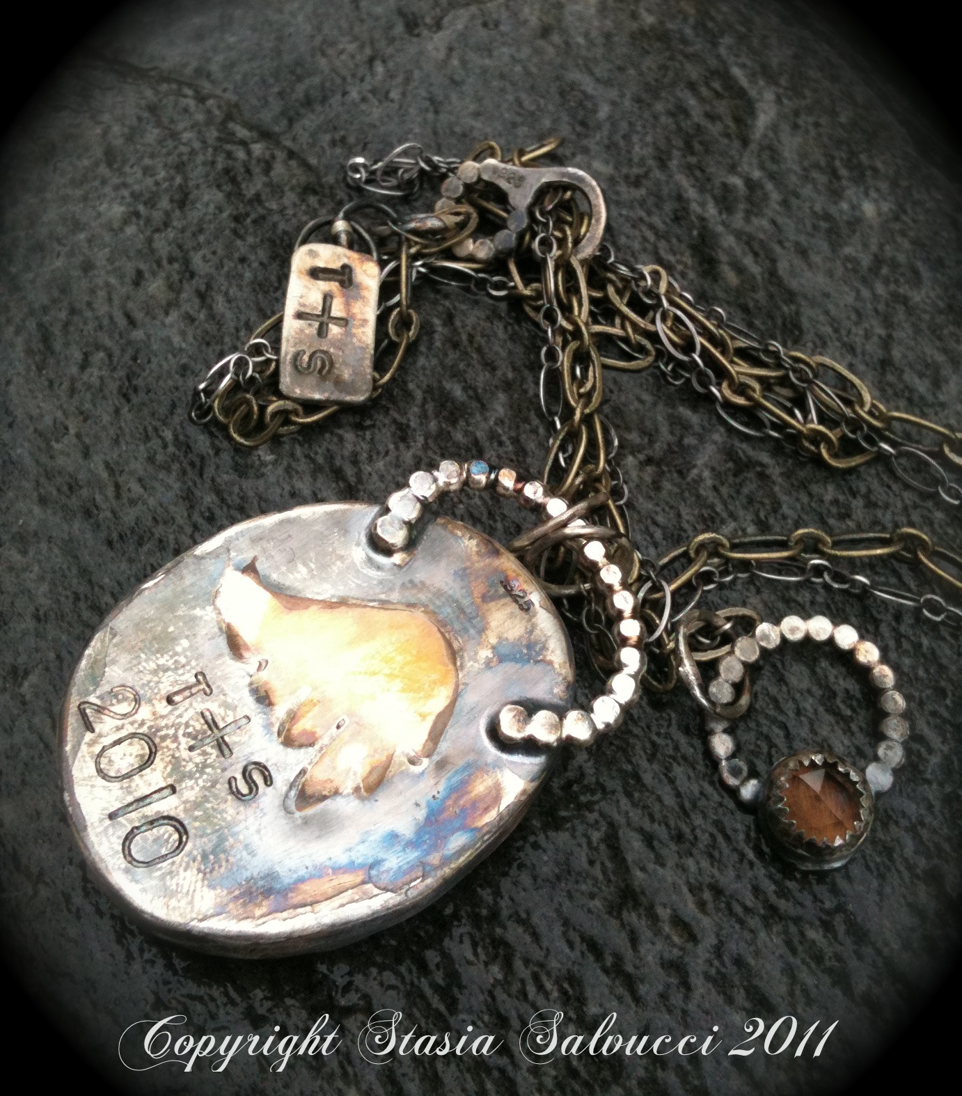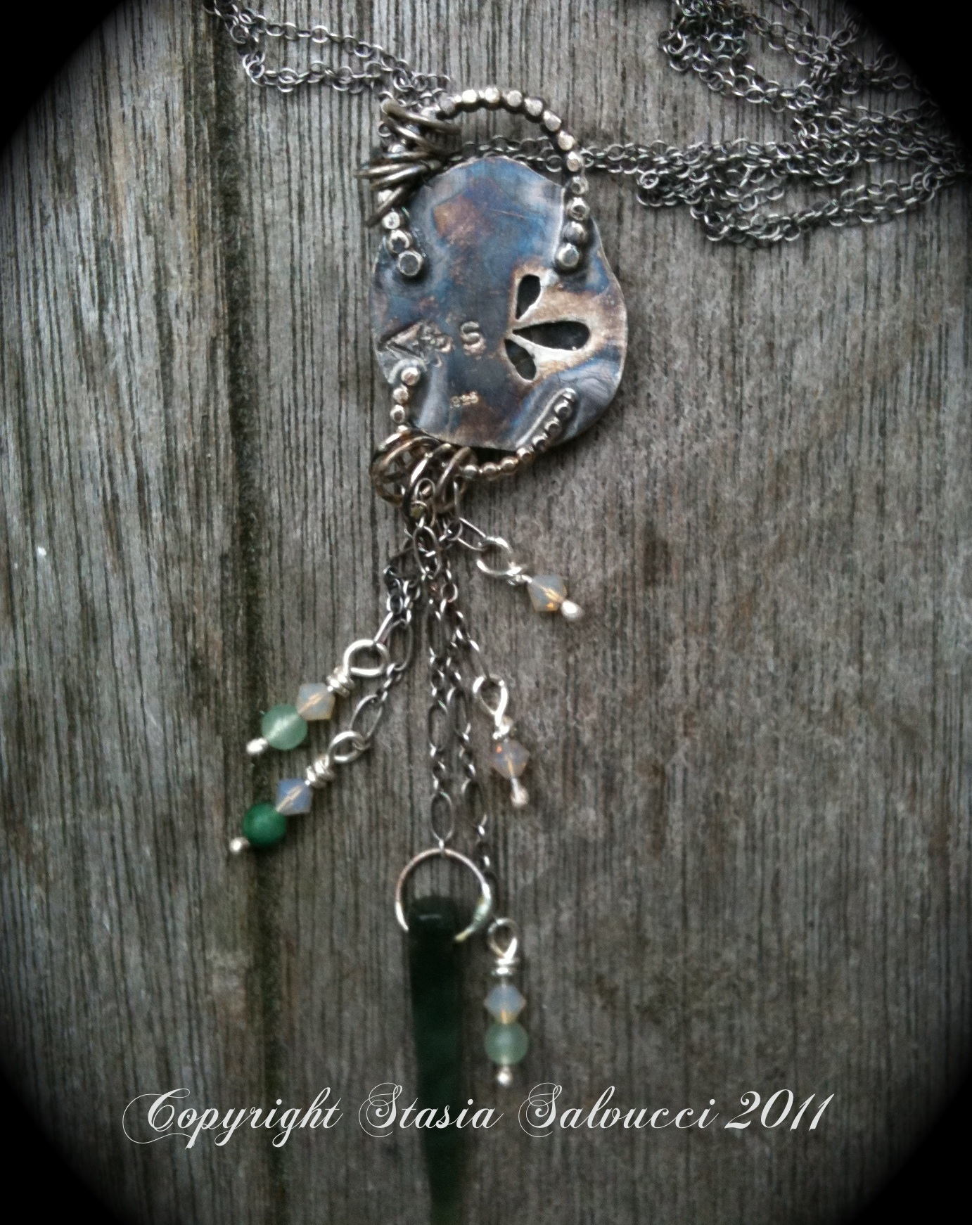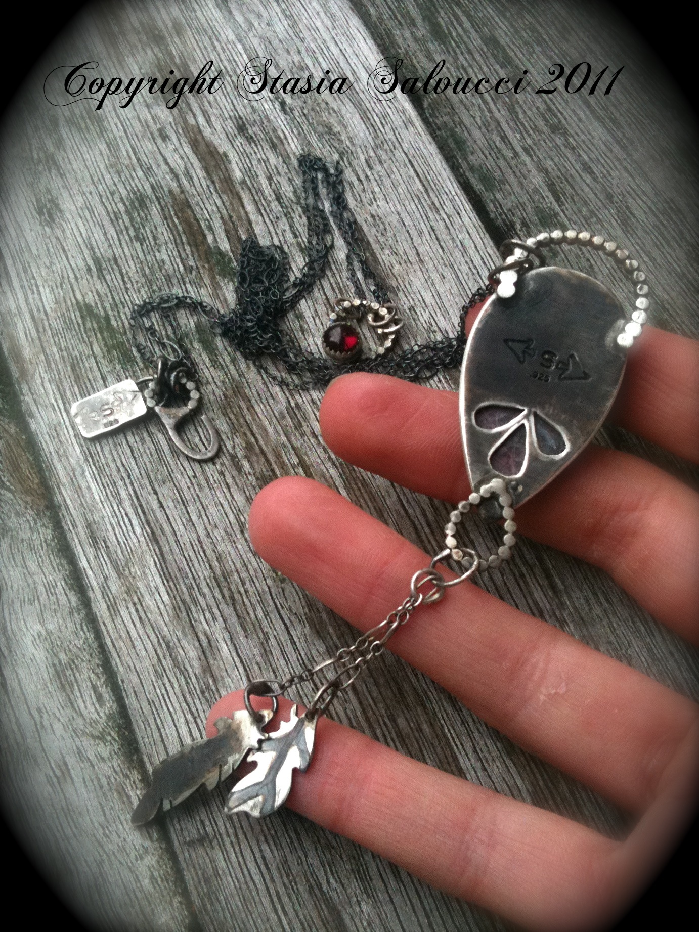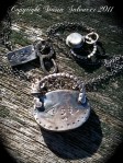 Other trades that happened: The badass Angela behind Concrete Polish Jewels traded me two of her Spike Crystal themed rings for a great pair of 1/2″ chrysocolla gemstone silver plugs. Linda the darling behind Fleatherfox snagged herself a black pyrite Mini Cave Lady ring for a Bow and Arrow knuckle ring. Arlie, the complete sweetie behind Urban Revisions, traded this huge glass statement necklace for a mini dark silver and 14k gold sapphire stacker ring…