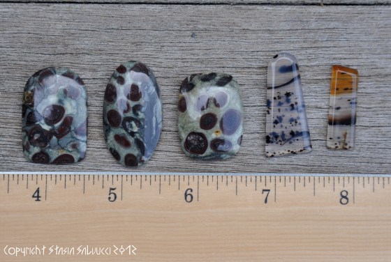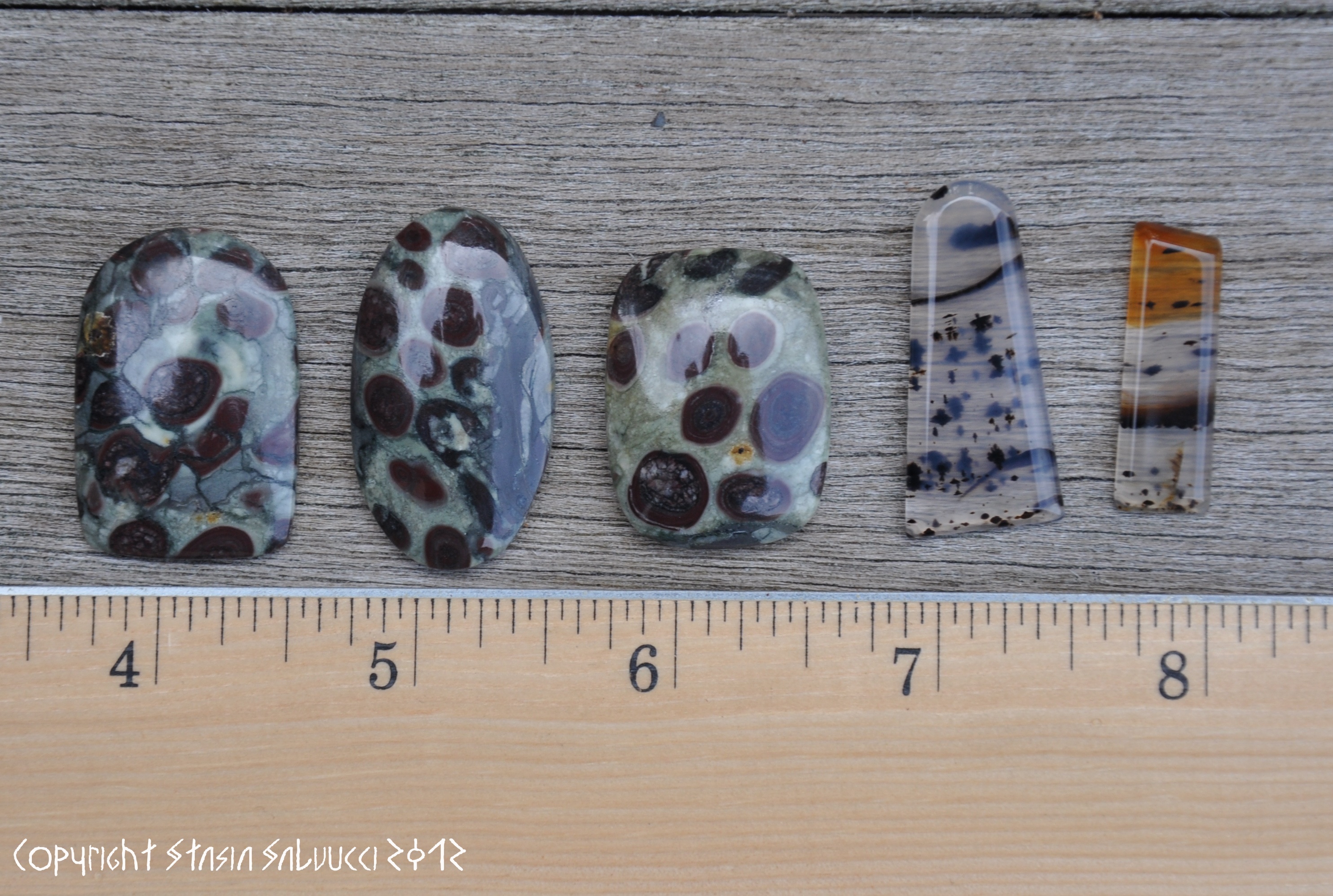 Below from left to right: primo Imperial Jasper Nodule, two lovely landscape jaspers, and two Mexican Bird’s Eye Ryholites!