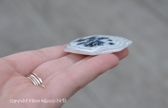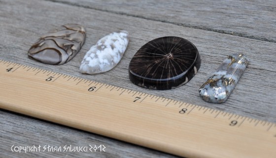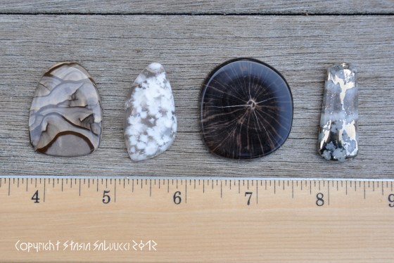 The jasper stones below I’ve heard called many names. The most popular are bird’s eye rhyolite, or ollithic limestone. Either way, whatever it is, it is definitely jasper, and fantastic! They remind me of lily pads, or rose gardens. The two stones on the right are slices of Montana Agates: