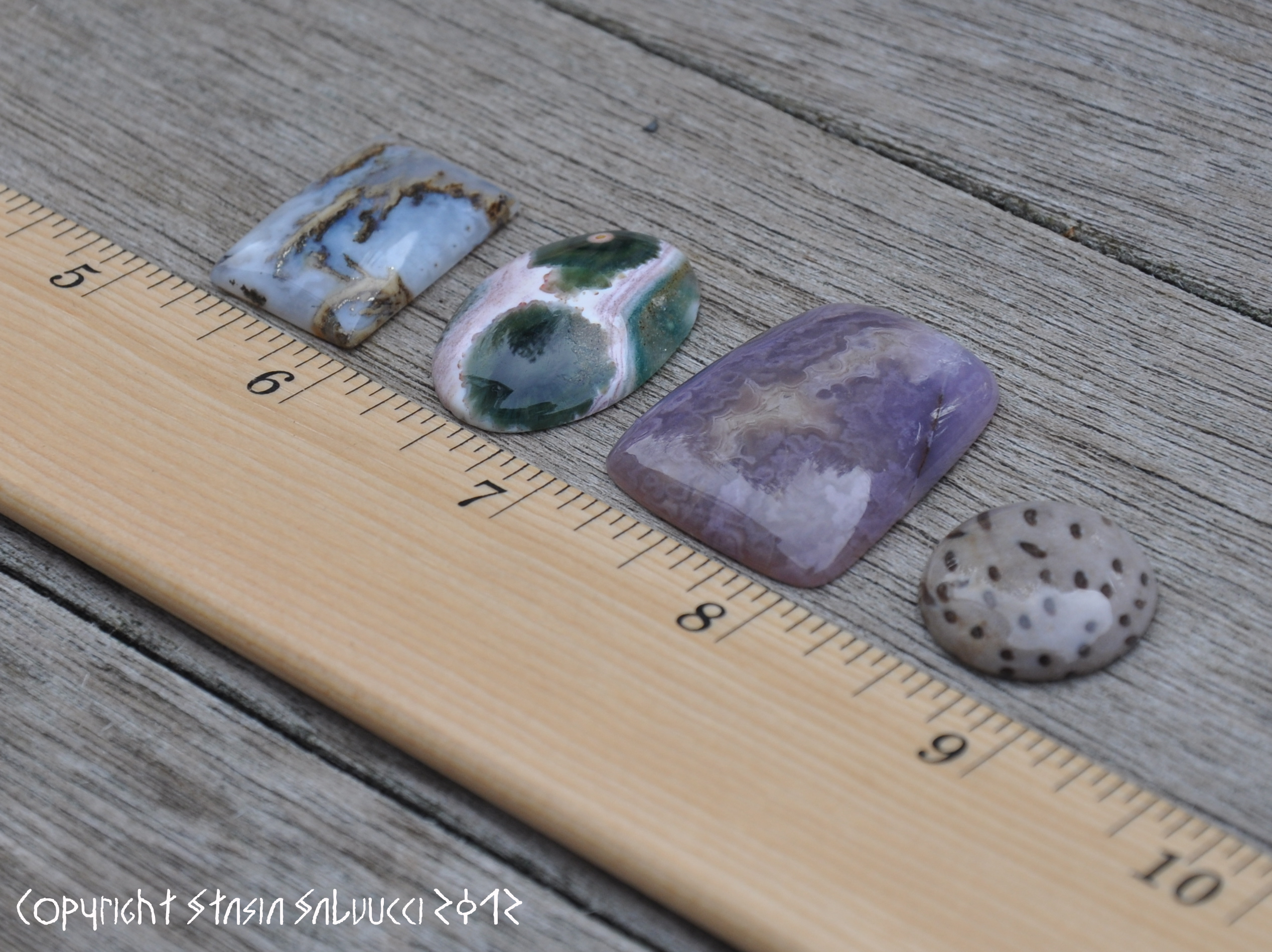Bottom row from left to right: picture jasper, plume agate, lace agate, and a beautiful little Imperial Jasper (lovely lovely olive and rust colours)