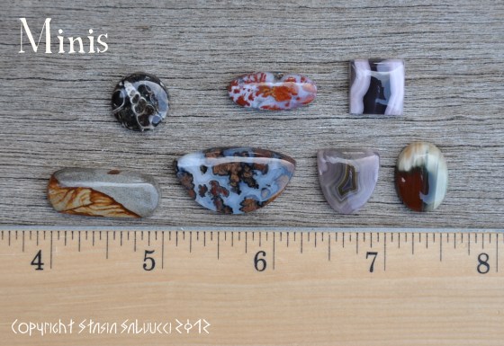 Next up-Mini cabs! Perfect for little rings or necklaces. From left to right, top row, we have: a sweet round mini Turritella Shell Fossil (perfect ring size!), red plume agate, and lace agate.