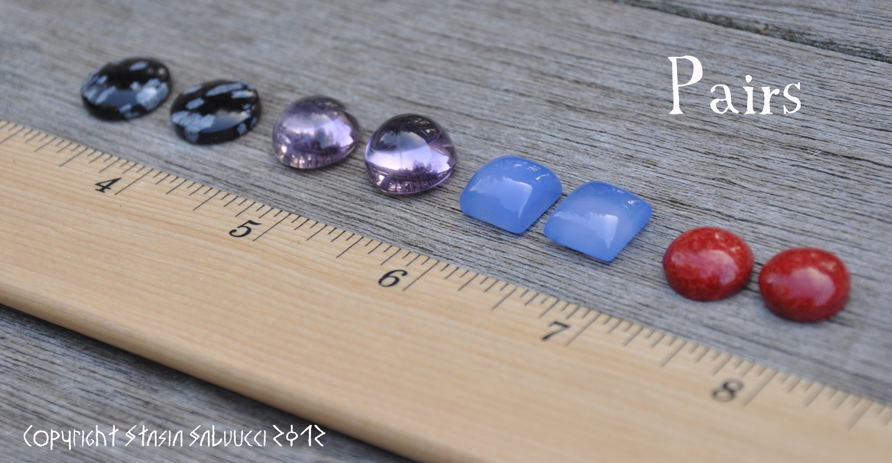 From left to right in the picture below, we have: two pairs of NATURAL rounded trillion cut drusy! Perfect for elegant plugs or earrings, especially fitting for events and weddings! Next to them is a pair of oval shaped Mastadon Ivory (which would look nice with wampum beads, non?), and a great pair of lemon chrysoprase.