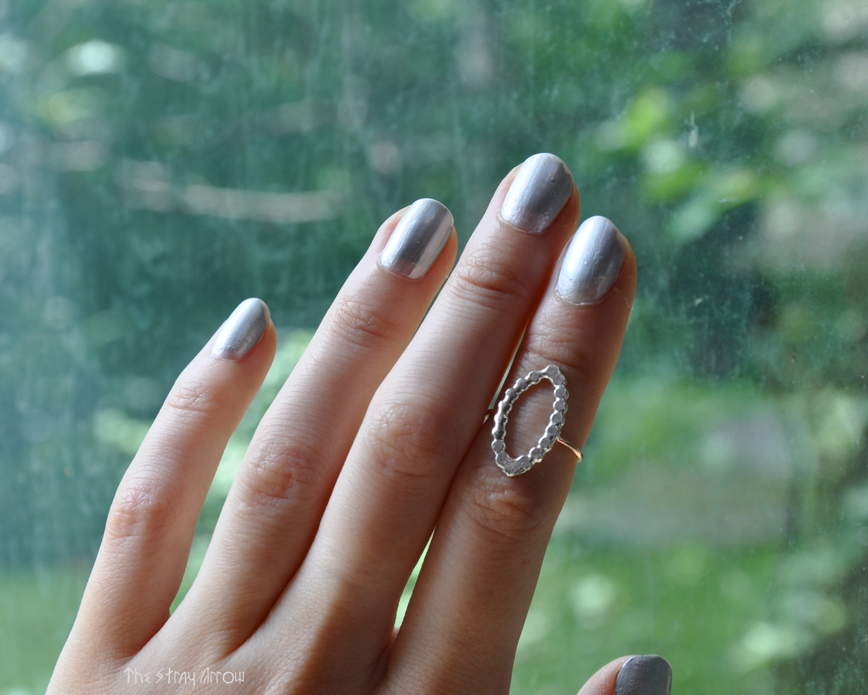 ^Dominique of Couture Vulture wearing Stray Arrow No-see-’ems, and mini crystal rings by Concrete Polish.
