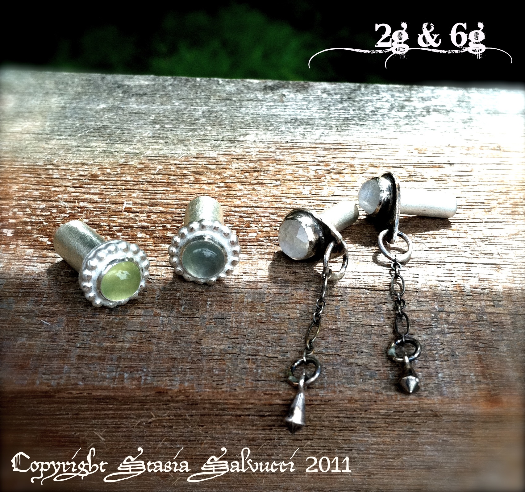 currently made are prehnite gemstone 2 gauge sterling plugs and 6 gauge faceted rainbow moonstone with silver bullet drop plugs (oxidized). More to come!…Including a super special pair of the new “Stormy Night” styles with 3D silver crows! Additionally more dangles for tunnels. Check ’em out in the gauged shop Sunday (GaugedbyStasia.Etsy.com)