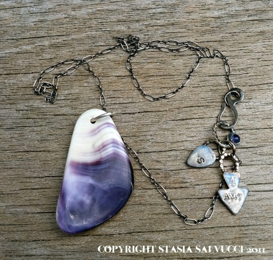 Last but certainly never least, a picture of a necklace I made for a friend’s birthday. This lovely features a hefty piece of genuine wampum, with silver arrow and tear drop tags, and an iolite gemstone silver clasp in my signature style!