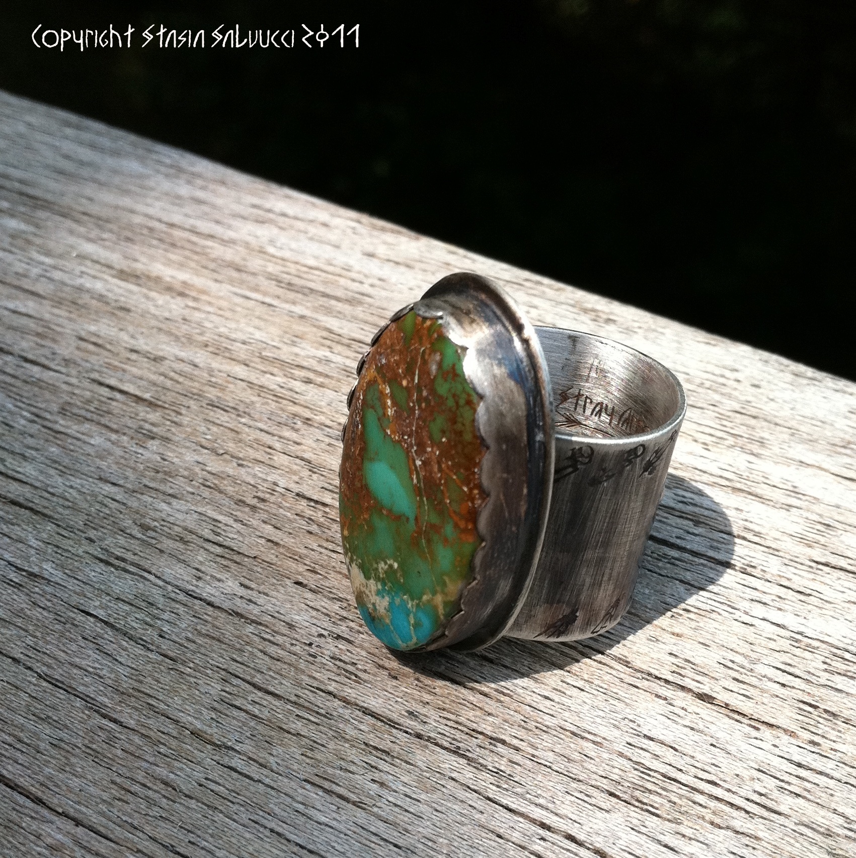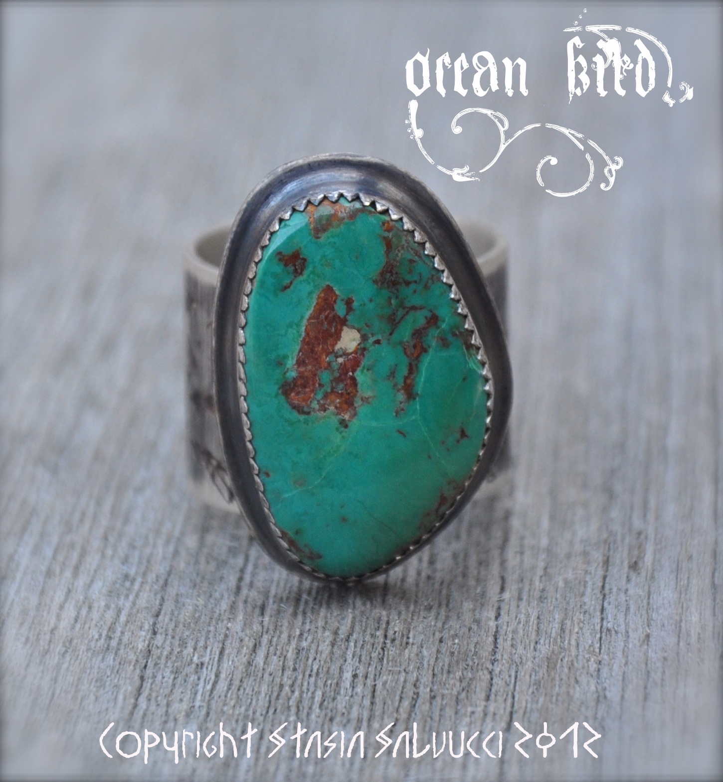 Another beauty from the Crow Springs Mine features a strange and unusual deeper teal colour: the Ocean Bird Turquoise Ring, with feathered band stampings: