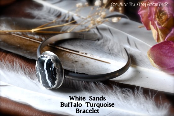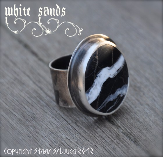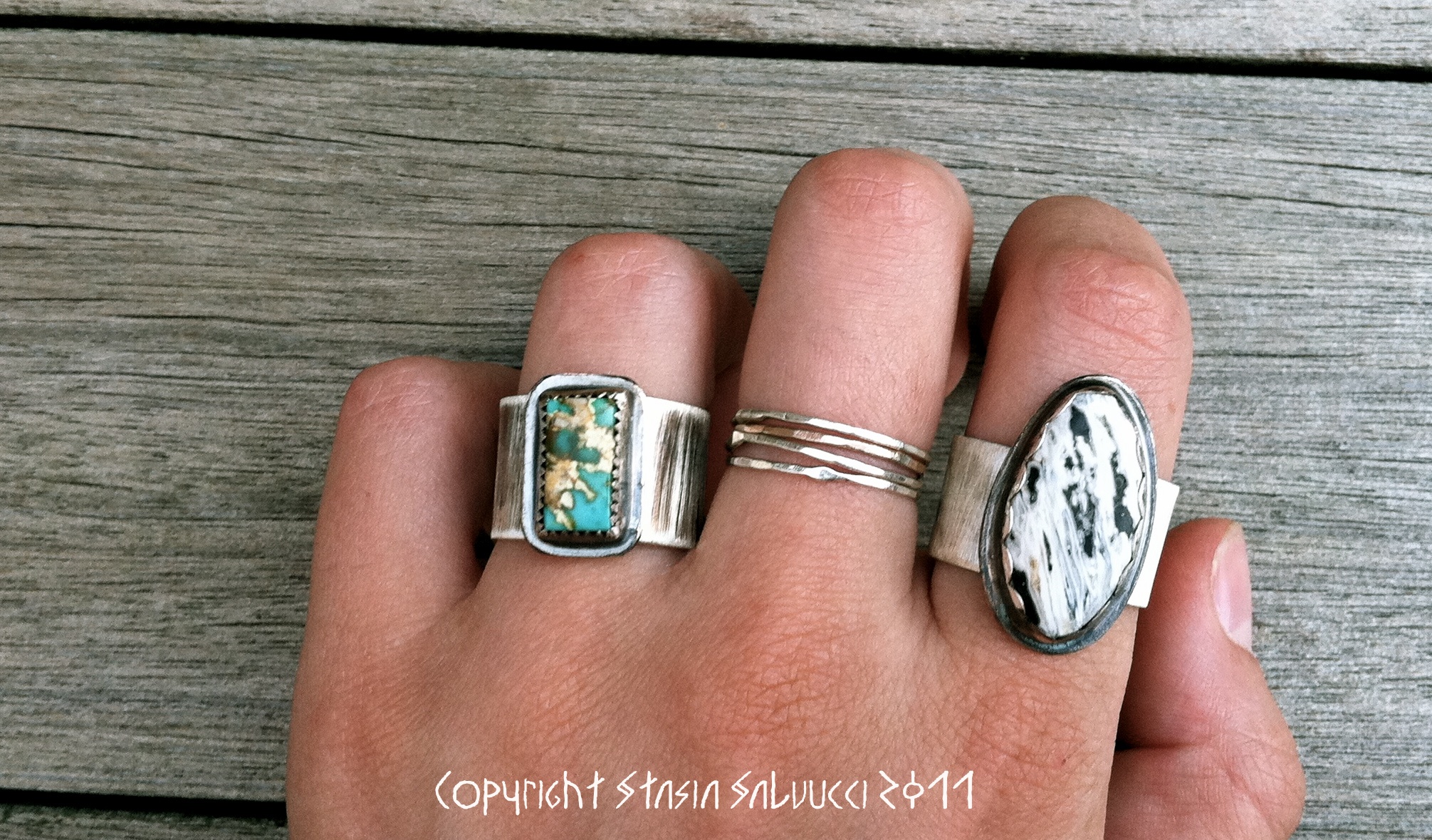 As for turquoise, we have ribbon cut White Buffalo Mine turquoise from AZ, Southwest, and light sky blue Campitos Mine turquoise, perfect sizes for rings~the White Buffalo ribbon cuts can be seen in the “White Sands” series, of which two have sold…and another will be joining the shop sometime Friday…