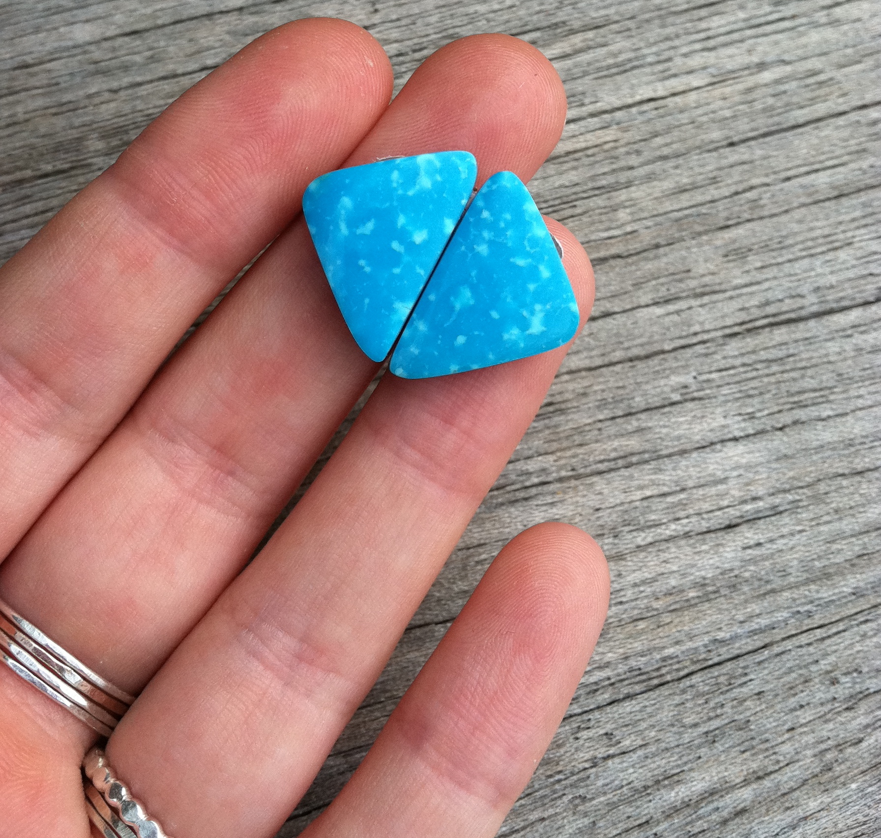 Our third and last pair are free form triangles-great for dangling bits/bottoms on gauges or normal sized earrings. They are Nacozari turquoise- a mine located in Mexico that is highly sought after for its extreme “blueness”. It occasionally can have black inclusions-this pair and one additional cab are all that I currently have from this mine. These lovelies have a very slight water web to them. They are roughly 20mm tall. I can see these swinging with open tunnels, moonstone, rose quartz, or more turquoise…