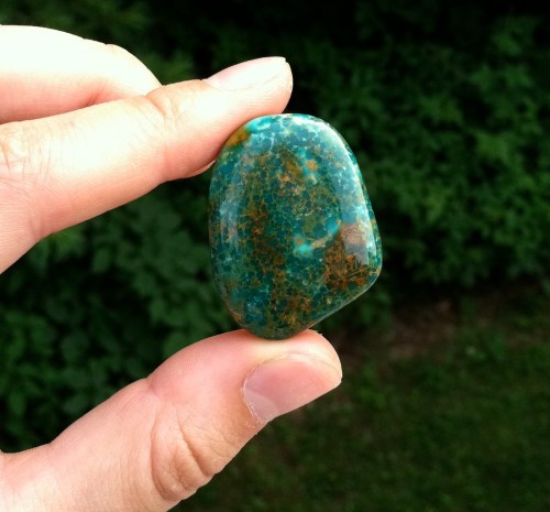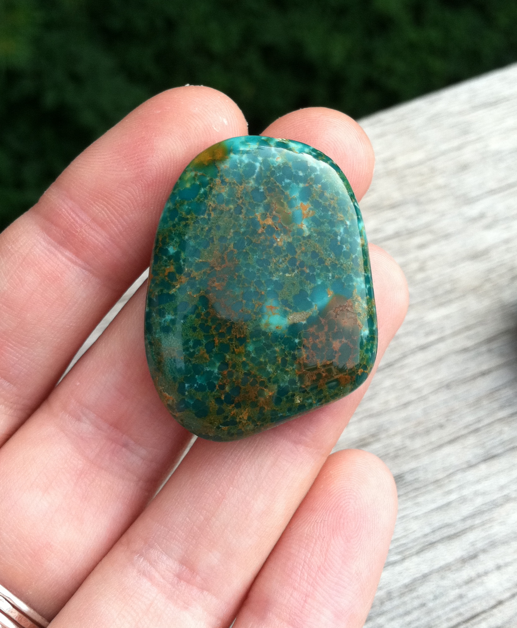 This natural webbed cab is from the Pilot Mountain Mine, and is not only the highest quality I’ve had from this mine, but one of the higher quality turquoise stones I have. period. The tight webbing is incredible, these photos are *unaltered*, and the depth of the lush green teals and rusty ochre patterning is drool-worthy (and collector’s quality, too).  I’m thinking about keeping this gem for myself, unless someone
