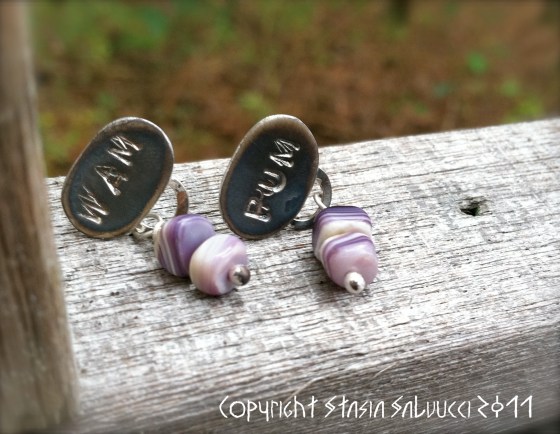 featuring mini natural genuine wampum shell beads in sterling jump rings and oxidized chains. On one earring mini sawed out circles are stamped with “WAM” on the other earrings “PUM”. To be added are sawed out silver arrows and my jeweler’s tag on each earring..