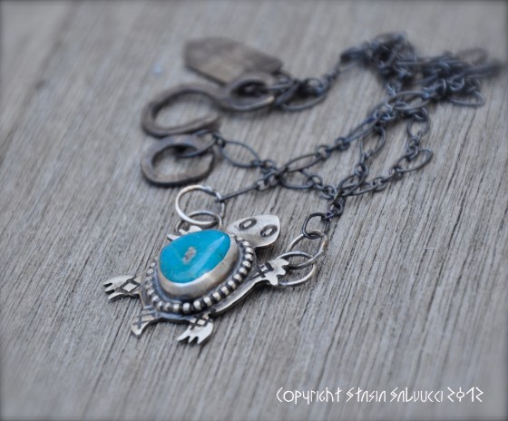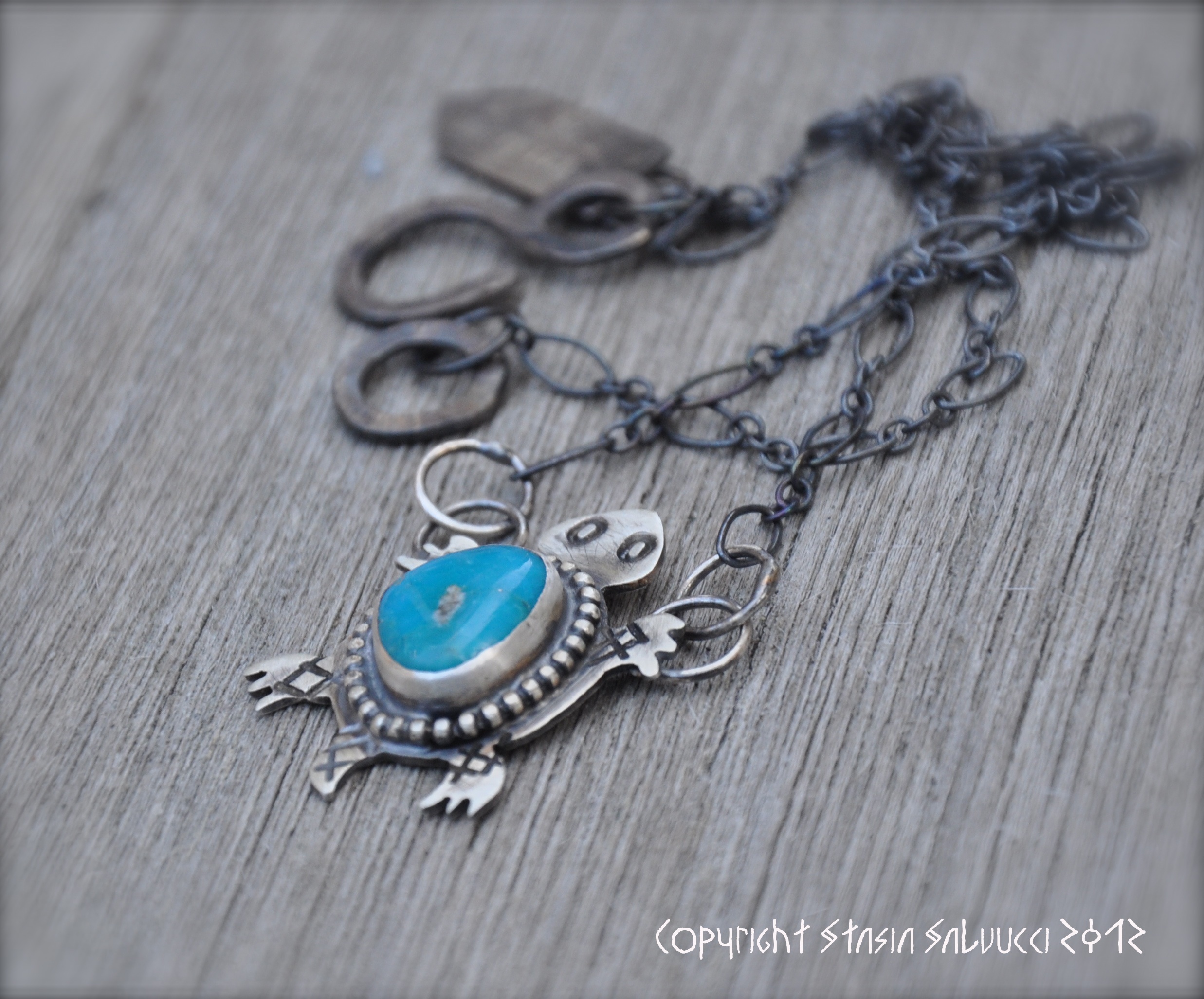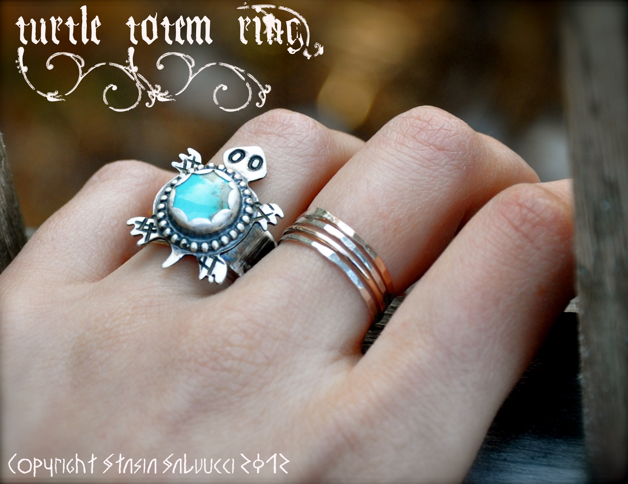 In addition to the recent Thunderbird necklace, I’ve added another little guy to the “TOTEM” collection: a turtle! The Turtle Totem necklace features a freeform piece of Kingman Mine turquoise, and to match the cutie pie-a turtle totem ring! The ring has a piece of Royston turquoise as his shell. The ring is a size 6.5, but I will be offering custom turtles with stones of your choosing in your own size once listed on Etsy!