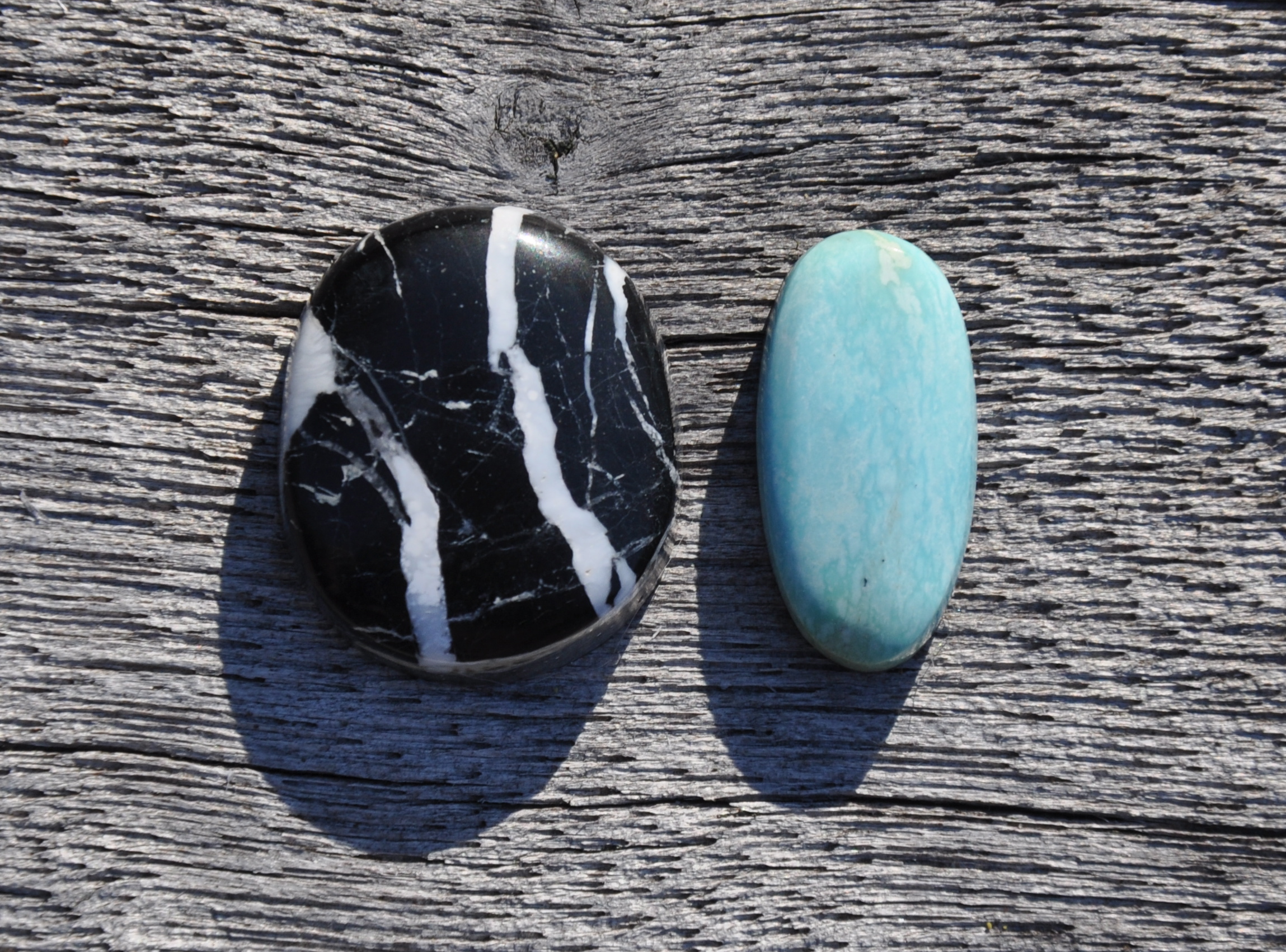 First up, we have mini Pilot Mountain mine turquoise with water webbing. “Water webs” in turquoise is like your basic spider web pattern-which is a web between the turquoise and host rock (the higher of qualities among turquoise). The difference is a water web is a webbing pattern entirely out of turquoise! As you can guess, this means its an even higher quality than your normal webbing. This mini pair is adorable, sweet, and roughly 7mm diameter for each cab. These would work in a plain style for anything 4 gauge and smaller, or higher gauges if given some kind of border…