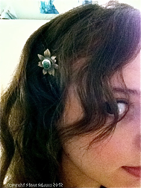 Now for my favourite new addition. Hand sawed of bronze and silver, turquoise flower hair pins and braid ends! These hair adornments can double as hair ties, or can be slipped onto a bobby pin. Sold in singles and pairs, below are examples of custom orders~